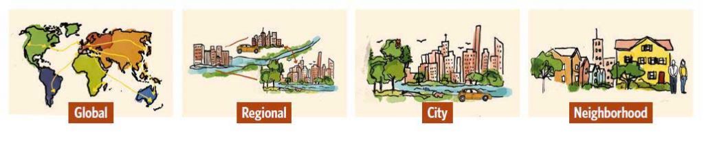 The Nature Conservancy in one of its scientific reports on ‘Nature in the Urban Century’8, addresses the need to focus on challenges due to urban growth at different scale of interactions: global, regional, city and neighborhood (Figure 2-1). This was, however, developed in the context of quantifying impacts of urban growth on biodiversity and human well-being.