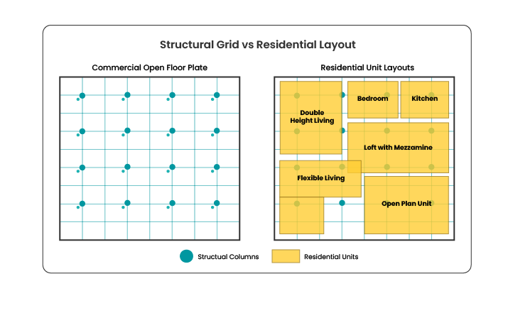 Commercial buildings feature large open floor plates with structural grids optimised for office use. These grids rarely align with residential room layouts, creating a fundamental mismatch between existing structure and required function.
