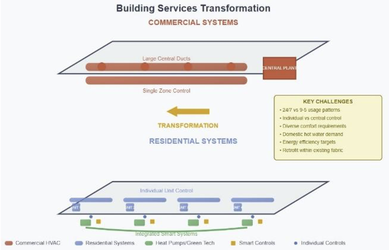 The most complex challenge involves transforming building services designed for large-scale commercial use into systems providing individual comfort control for residential units. Commercial HVAC, electrical and plumbing networks require complete reimagining.